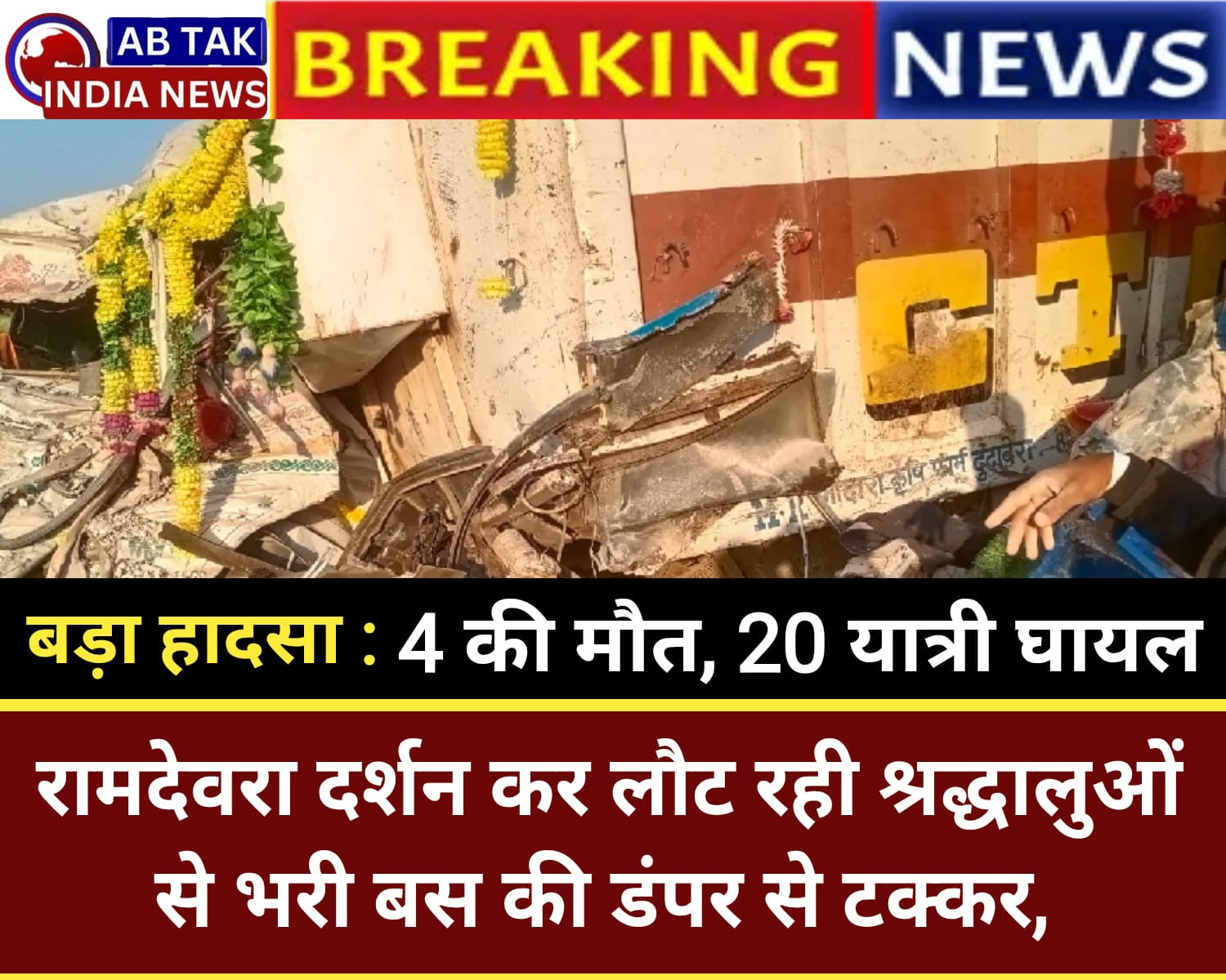बस के सामने एक जगह कंकरी पड़ी थी, जिससे बचने के लिए चालक ने मोड़ा तो डंपर ने टक्कर मार दी. हादसे में बीस लोग प्रभावित हुए. इनमें चार जनों की मौत हो गई. पुलिस ने बताया कि बस में सवार 50 से ज्यादा सवारियां गुजरात के मोडासा सहित आसपास के इलाकों की हैं. इनमें रावल वीनू भाई, सुरेश, जयेश और एक अन्य की मौत हो गईं. अस्पताल अधीक्षक डॉ. राजपुरोहित ने बताया कि घायलों के कई तरह की इंजरी हैं. ज्यादातर के आर्थोपेडिक इंजरी हैं.