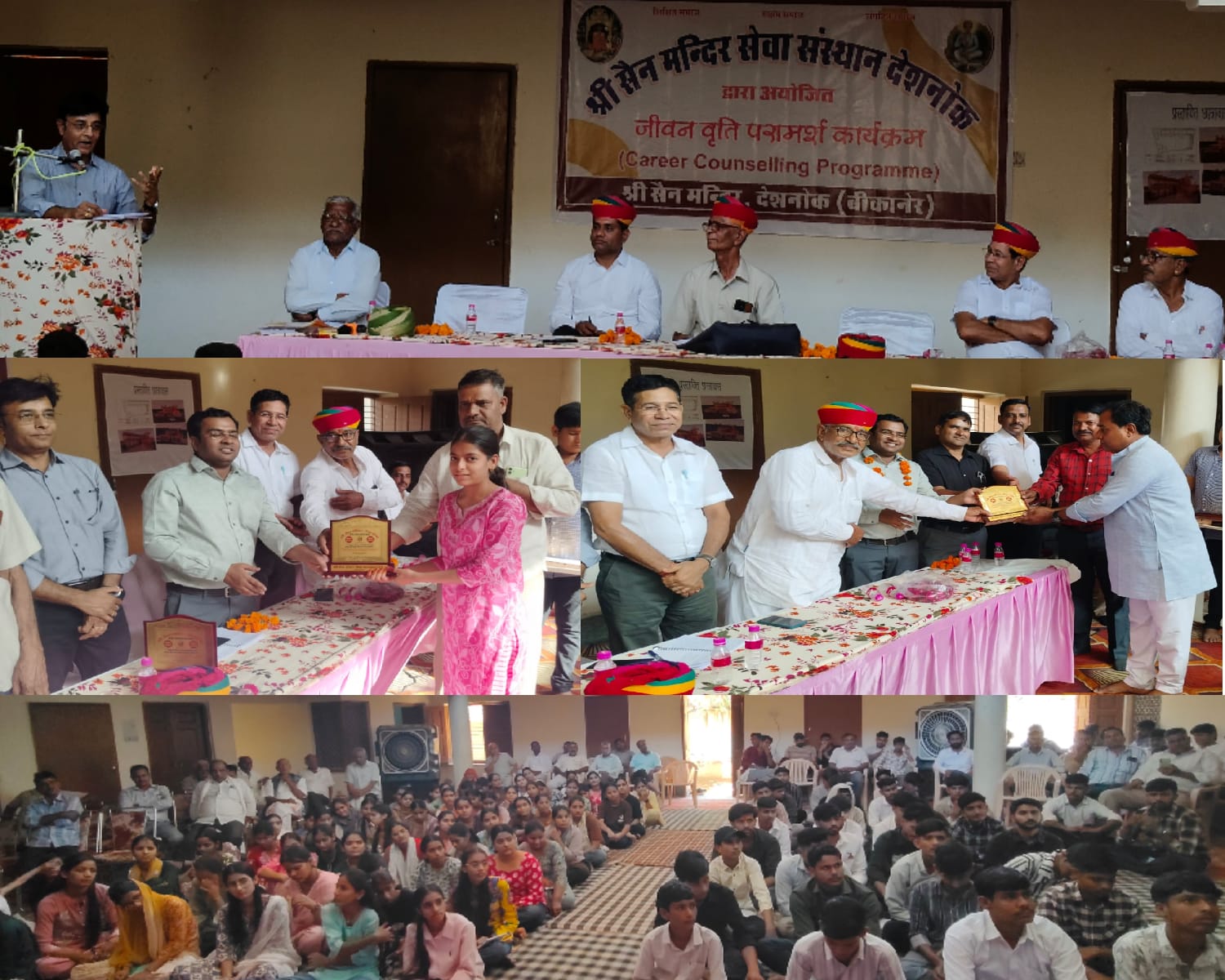 अबतक इंडिया न्यूज देशनोक 15 अप्रैल । सैन जयंती के अवसर पर देशनोक सैन समाज ट्रस्ट द्वारा बुधवार को कैरियर काउंसिंग सेमिनार और प्रतिभावान बच्चों का पुरस्कार वितरण सम्मान समारोह का आयोजन हुआ।सैन मंदिर ट्रस्ट के अध्यक्ष जगदीश प्रसाद चौहान ने बताया कि दो दिवसीय सैन जयंती के अवसर पर प्रथम दिवस में सैन महाराज की शोभायात्रा , बालिकाओ की विभिन्न प्रतियोगिताओं का आयोजन हुआ दूसरे दिन भूरा भवन में सर्व सैन समाज द्वारा कैरियर काउंसलिंग गाइड कार्यक्रम का आयोजन हुआ। इस कार्यक्रम के मुख्य अतिथि और प्रमुख वक्ताओं में प्रमुख शिक्षाविद राज्यपाल से सम्मानित ओमप्रकाश तंवर , प्रमुख चिकित्साविद मदन लाल हर्षवाल , प्रमुख शिक्षा विद मुकुल भाटी , राजकीय पॉलिटेक्निक महाविद्यालय के सिविल ब्रांच के हेड सुमित कुमार भाटी , हेल्पिंग हैंड सोसाइटी के मणिकांत मॉयल व पीबीएम बीकानेर के त्वचा रोग विशेषज्ञ डॉ राधेश्याम नाई ने अपने अपने विषयों पर बच्चों के साथ काउंसिंग की जिसमें शिक्षा , तकनीकी , सरकारी भर्तियों में तैयारी की महत्वपूर्ण जानकारी साझा की। इस अवसर पर कोलायत मंडल के अध्यक्ष शंकर लाल चौहान ने शिक्षा का महत्व बताया ।