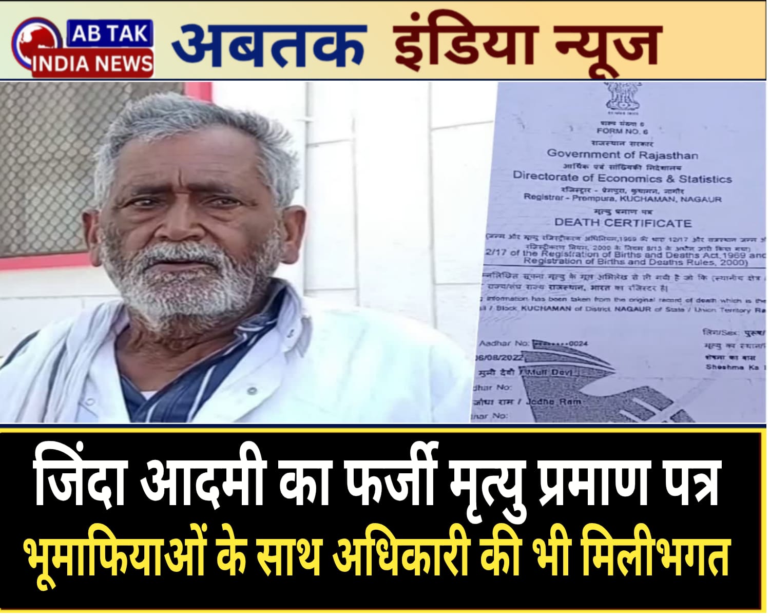 इस मामले में पीड़ित बुजुर्ग हनुमान राम जाट ने जिला कलेक्टर को शिकायती पत्र सौंपकर न्याय की गुहार लगाई है और दोषियों के खिलाफ कार्रवाई की मांग की है. पीड़ित हनुमान राम के अनुसार, भू-माफिया ने ग्राम विकास अधिकारी और संबंधित कर्मचारियों के साथ सांठगांठ कर 6 अगस्त 2022 को उनका मृत्यु प्रमाण पत्र जारी करवा दिया. हद तो तब हो गई जब 20 अगस्त 2022 को उनका फर्जी मृत्यु प्रमाण पत्र ऑनलाइन भी जारी करवा दिया गया.