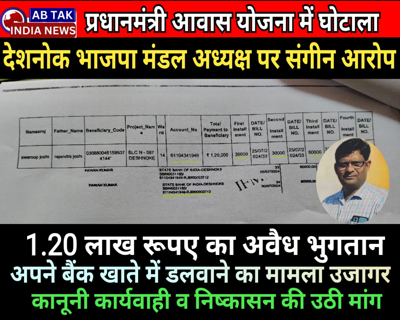 अबतक इंडिया न्यूज 17 दिसंबर देशनोक । देशनोक नगरपालिका में पीएम आवास योजना को लेकर कईबार भ्रष्टाचार के आरोप लग चुके है।लेकिन इसबार यह तथ्यात्मक आरोप देशनोक भाजपा मंडल अध्यक्ष पवन पंचारिया पर लगे है।स्वरूप नामक लाभार्थी का योजनांतर्गत तीन किस्तों का भुगतान(₹ 30,000, 3,0000 ,60,000=1,20,000) एक लाख 20 हजार अपने खाते भुगतान करवाने का आरोप भाजपा मंडल अध्यक्ष पर लगा है।