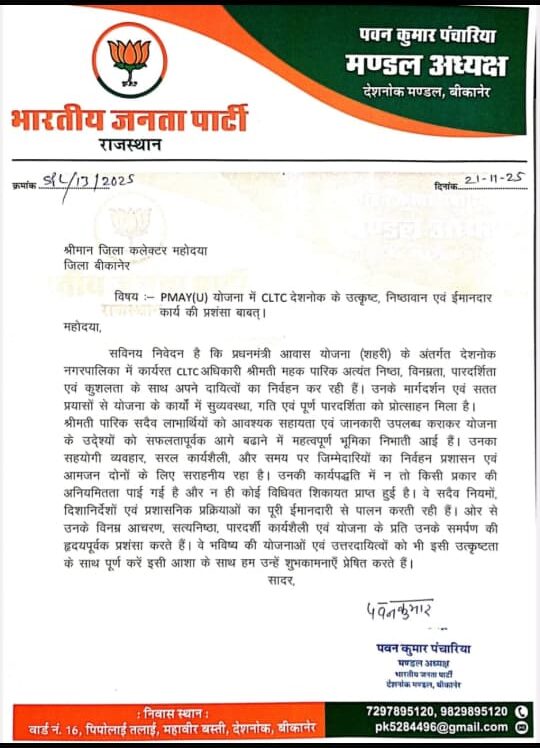 हाल ही में पीएम आवास योजना में किस्तों के भुगतान को लेकर देशनोक पालिका की सीएलटीसी कर्मी महक पर भ्रष्टाचार के आरोप लगे थे तब देशनोक भाजपा मंडल अध्यक्ष पवन कुमार ने कर्मी के पक्ष में खुला प्रशंसा पत्र जारी कर दिया।अब उस पत्र के सही मायने सामने आए हैं।जो भाजपा सुशासन व भ्रष्टाचार मुक्त भारत की बात करती है उसी पार्टी का एक मंडल अध्यक्ष स्वयं भ्रष्टाचार में लिप्त होने के आरोपो से गिरा हुआ है वो किसी और भ्रष्टाचार के आरोपी कर्मचारी के पक्ष में तारीफों के पुल बांधकर आधिकारिक तौर पार्टी लेटर पर लिखकर सार्वजनिक तौर पर जारी करता है…यह भाजपा के लिए बेहद शर्मनाक हैं।