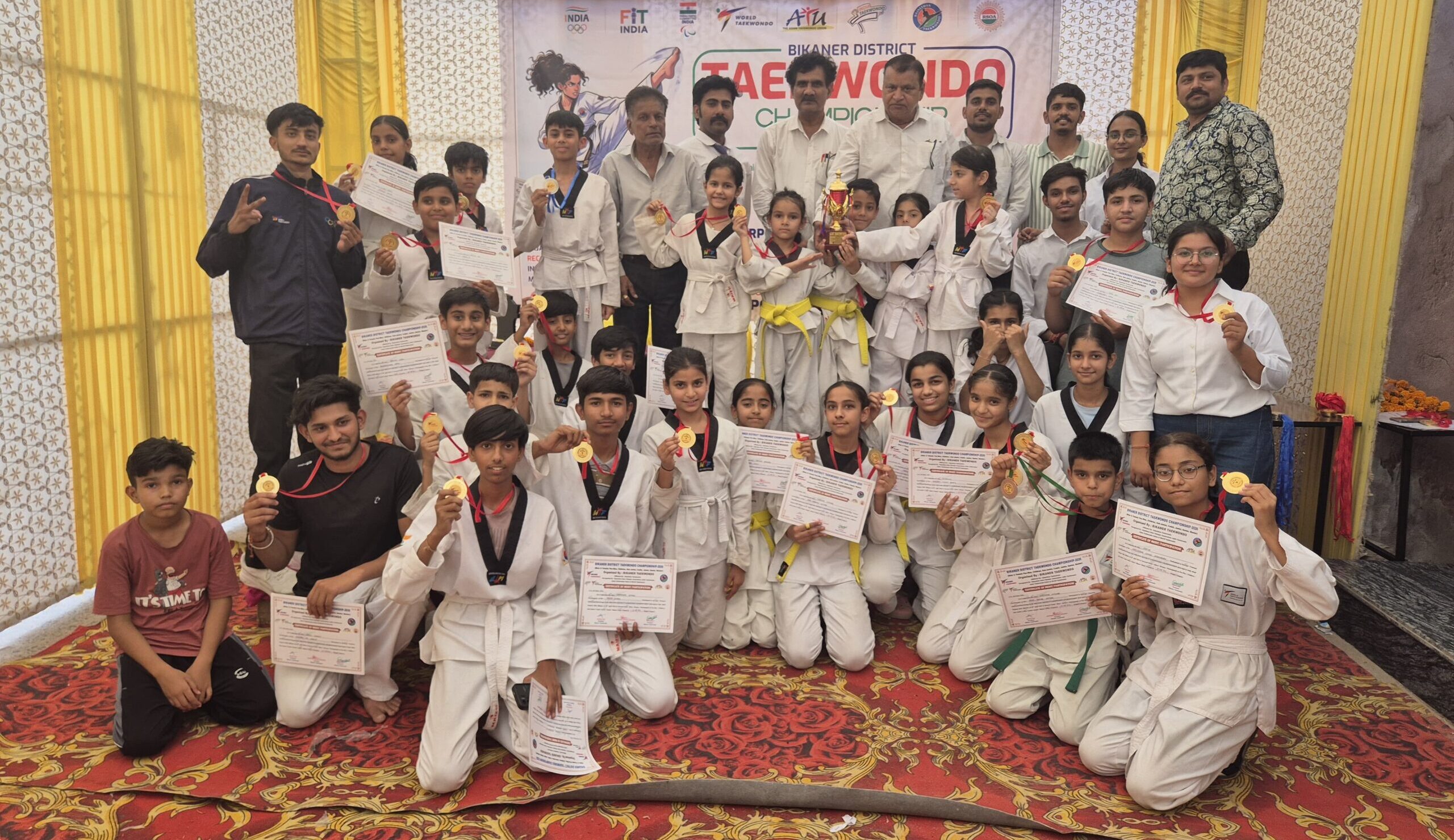 32 गोल्ड, 01 सिल्वर व 01 ब्रोंज सहित कुल 34 मेडल्स जीतने पर ओवरऑल विनर ट्राॅफी वैदिक मार्शल आर्ट एकेडमी पुरानी गिन्नानी को दी गई वहीं ओवरऑल रनरअप ट्राॅफी 06 गोल्ड, एक सिल्वर व एक ब्रोंज सहित 08 मेडल जीतने पर वारियर मार्शल आर्ट्स एकेडमी बीकानेर को प्रदान की गई। पुरस्कार वितरण समारोह में अतिथियों द्वारा प्रतिभागी एकेडमी कोचेज, रेफरीज तथा ओफिशियल को मोमेंटो देकर सम्मानित किया गया। इससे पहले प्रतियोगिता का शुभारंभ अतिथियों द्वारा भगवान परशुराम के तेलचित्र पर माल्यार्पण एवं दीप प्रज्जवलन कर किया गया। मुख्य अतिथि ओलंपिक जिला सचिव माणकचंद व्यास ने संबोधित करते हुए कहा कि मोबाइल युग में पेरेंट्स को सजगता से महत्वपूर्ण भूमिका निभानी होगी तभी खिलाड़ी घर-घर से निकल सकेंगें। बीकानेर के ताईक्वांडो खिलाड़ियों ने वर्ल्ड चैंपियनशिप में मेडल जीतकर बीकाणे का मान बढ़ाया हैं। बीकानेर ताइक्वांडो जिला सचिव देवेन्द्र सारस्वत ने बताया कि जिला स्तरीय ताईक्वांडो प्रतियोगिता में बीकानेर से 46 गोल्ड मेडलिस्ट खिलाड़ियों का चयन राज्य स्तरीय ताईक्वांडो प्रतियोगिता में हुआ है जो आगामी 15 से 17 मई तक जयपुर में आयोजित होगी। संदीप बरोड़, अंकित प्रजापत, चित्रा स्वामी, वाहिद कादरी, अक्षिता बिश्नोई, करण चौहान ने निर्णायकों की भूमिका निभाई। आयोजन सचिव धनंजय सारस्वत ने उपस्थित आगुंतकों का आभार जताया।