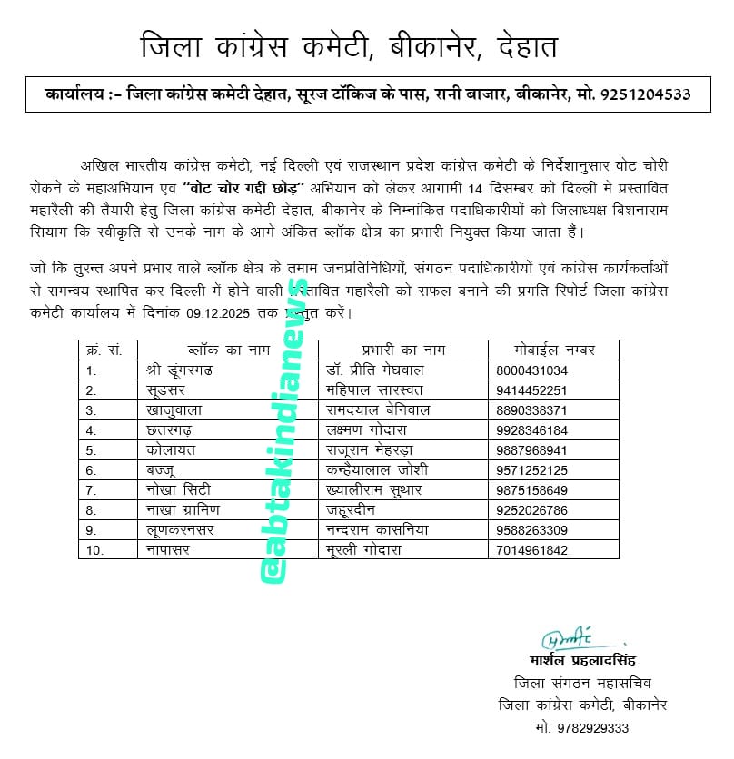 अबतक इंडिया न्यूज 8 दिसंबर बीकानेर । अखिल भारतीय कांग्रेस कमेटी, नई दिल्ली एवं राजस्थान प्रदेश कांग्रेस कमेटी के निर्देशानुसार वोट चोरी रोकने के महाअभियान एवं ‘‘वोट चोर-गद्दी छोड़’’ अभियान को लेकर आगामी 14 दिसम्बर को दिल्ली में प्रस्तावित महारैली की तैयारी हेतु जिला कांग्रेस कमेटी देहात, जिलाध्यक्ष बिशनाराम सियाग कि अनुमति से जिला संगठन महामंत्री मार्शल प्रहलादसिंह ने निम्नांकित पदाधिकारीयों को उनके नाम के आगे अंकित ब्लॉक क्षेत्र का प्रभारी नियुक्त किया हैं।