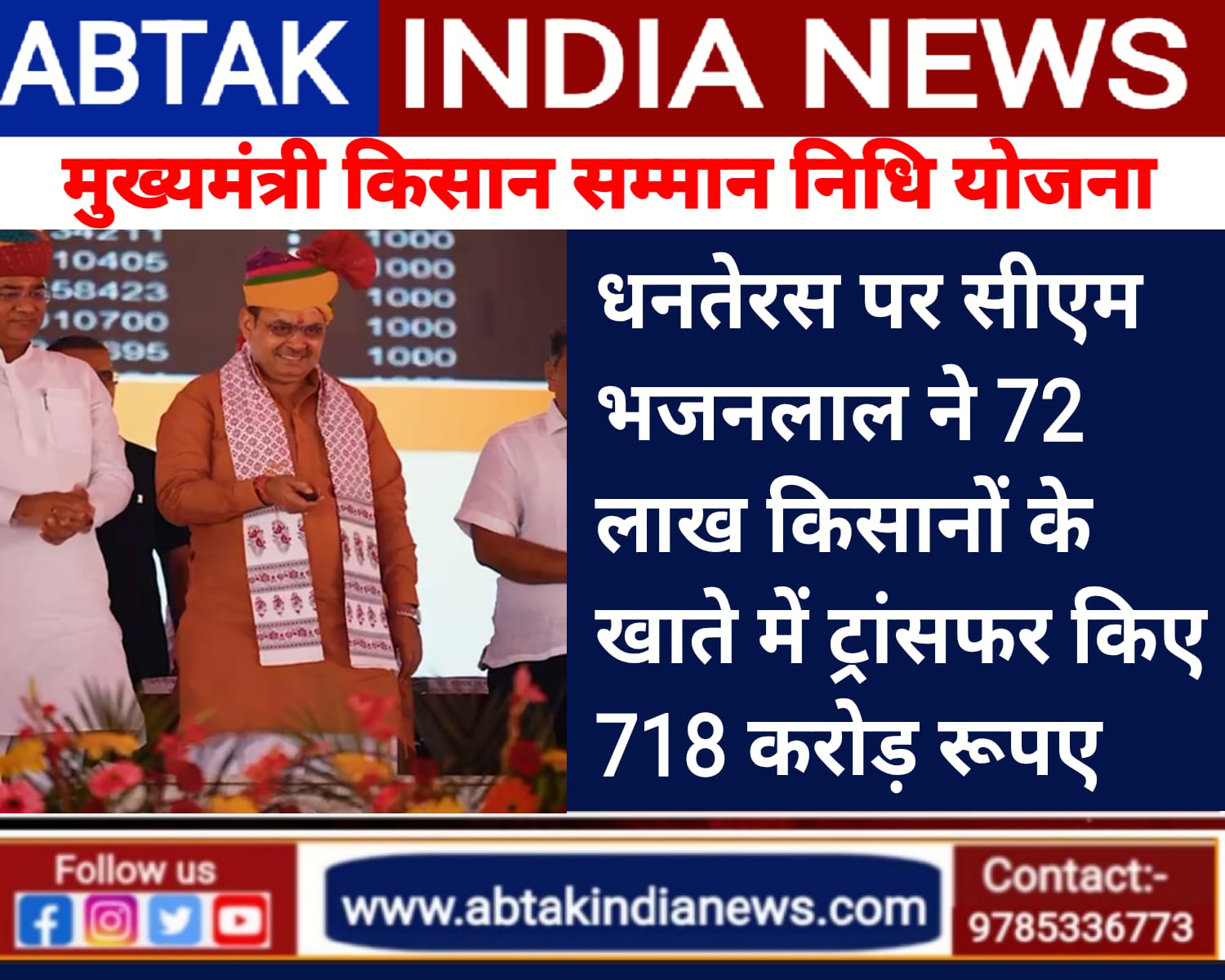 अबतक इंडिया न्यूज 18 अक्टूबर । राजस्थान के मुख्यमंत्री भजनलाल शर्मा शनिवार को भरतपुर दौरे पर रहे. इस दौरान सीएम ने नदबई में आयोजित एक कार्यक्रम में मुख्यमंत्री किसान सम्मान निधि योजना की चौथी किस्त जारी की है. इस योजना के तहत प्रदेश के लगभग 72 लाख किसानों के खाते में करीब 718 करोड़ रुपये ट्रांसफर किए गए हैं. सीएम भजनलाल ने कार्यक्रम को संबोधित करते हुए कहा कि पीएम मोदी ने किसानों को उनके कल्याण के लिए किसान सम्मान निधि योजना शुरू की थी.