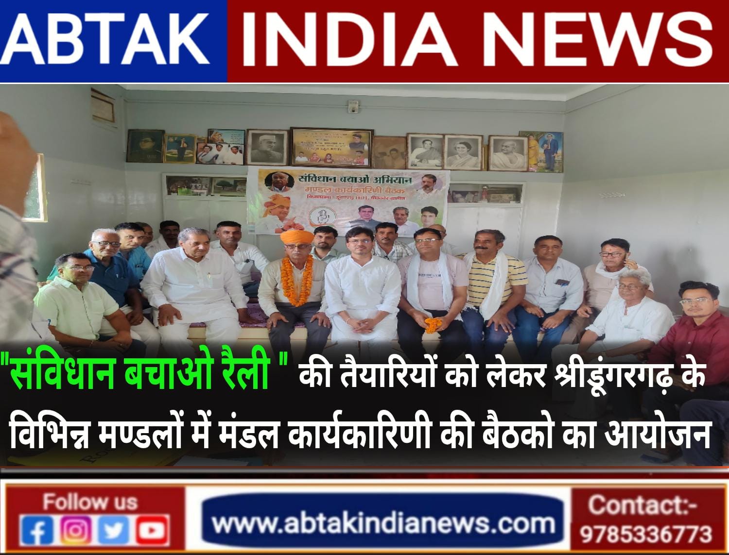 श्रीडूंगरगढ़ विधानसभा के दो ब्लॉक में आगामी समय में संविधान बचाओ रैली के सफलतम आयोजन हेतु रविवार को प्रभारी रामदेव ढाका और पूर्व विधायक मंगलाराम गोदारा द्वारा श्रीडूंगरगढ़, उदरासर, मोमासर और रीड़ी आदि मण्डलों में मण्डल कार्यकारिणी की बैठक आयोजन किया गया और आमजन तथा कार्यकर्ताओं को संविधान बचाओ अभियान के बारे में बताया। इन बैठक में संगठन की मजबूती हेतु रूपरेखा तैयार करना, मण्डलों की मीटिंग, बीएलए फॉर्म भरवाना, प्रत्येक बूथ पर 11 लोगों की कार्यकारिणी, ग्राम पंचायत अध्यक्ष व उसकी कार्यकारिणी, ब्लॉक और मण्डल की कार्यकारिणी में सम्मिलित पदाधिकारियों को निर्देश जारी किया। पूर्व विधायक मंगलाराम गोदारा ने बताया कि श्रीडूंगरगढ़ में रैली का आयोजन के माध्यम से सरकार से संवैधानिक संस्था बचाने और जातीय जनगणना मांग की जाएगी एवं साथ ही स्थानीय मुद्दों को लेकर ज्ञापन दिया जाएगा। संगठन सृजन कार्यक्रम के तहत आने वाले समय में संगठन को बूथ लेवल तक मजबूत किया जाएगा।