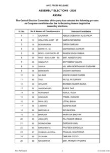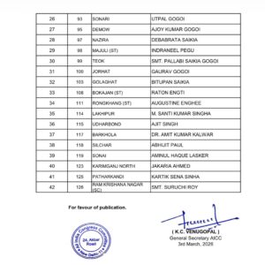 कांग्रेस ने बोंगाईगांव से गिरीश बरुआ, बरपेटा (SC) से महानंदा सरकार, बोको-चायगांव (SC) से रामेन सिंह राभा को उम्मीदवार बनाया है. हाजो-सुआलकुची (SC) से नंदिता दास, कमलपुर से सत्यब्रत कलिता को टिकट दिया है. इसके अलावा, बरखेत्री से दिगंता बर्मन, नलबाड़ी से अशोक कुमार सरमा, तिहु से रतुल पटुवारी को टिकट दिया है. बुबुल दास को जागीरोड (SC) से, उत्पल बनिया को राहा (SC) से प्रत्याशी बनाया है.