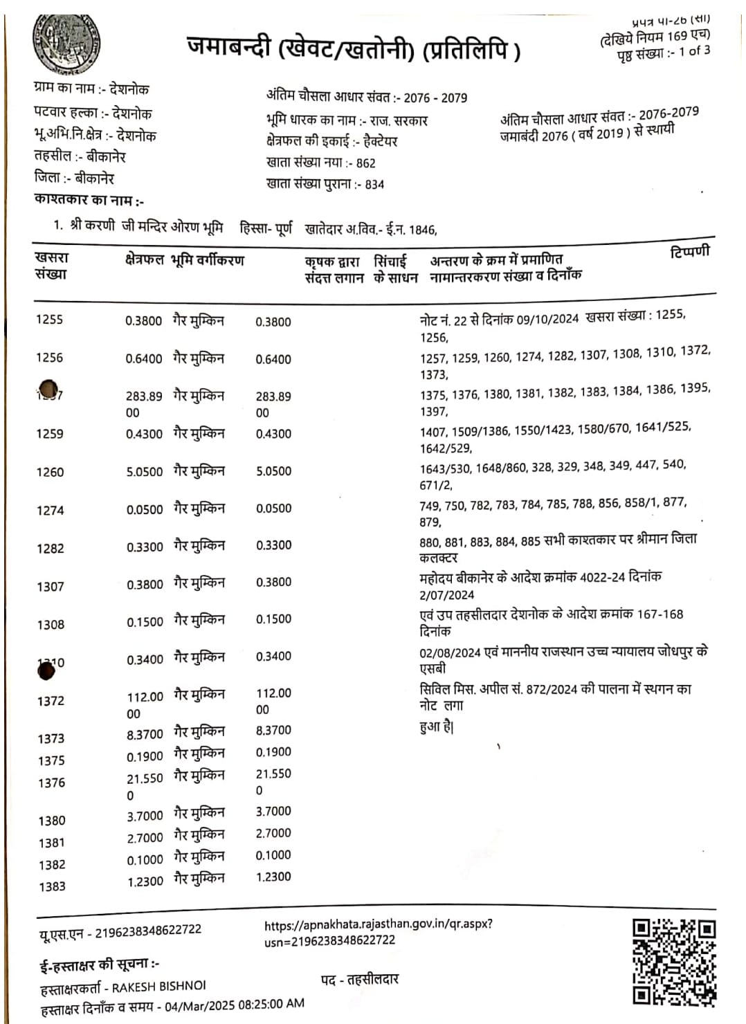 862 पर आज भी कायम है तथा इसी क्रम में बीकानेर  जिला कलेक्टर  के आदेश क्रमांक 4022-24 दिनांक 2/07/2024 के द्वारा सम्पूर्ण उपरोक्त खाता संख्या पर राजस्वा रिकॉर्ड जमाबंदी में नोट लगा हुआ है। ज्ञापन में शिकायत है की ओरण भूमि के इन  खसरो (785,783,782,784,750,749,671/2,1580/670,540,1643/530,1642/529,1641/525,447