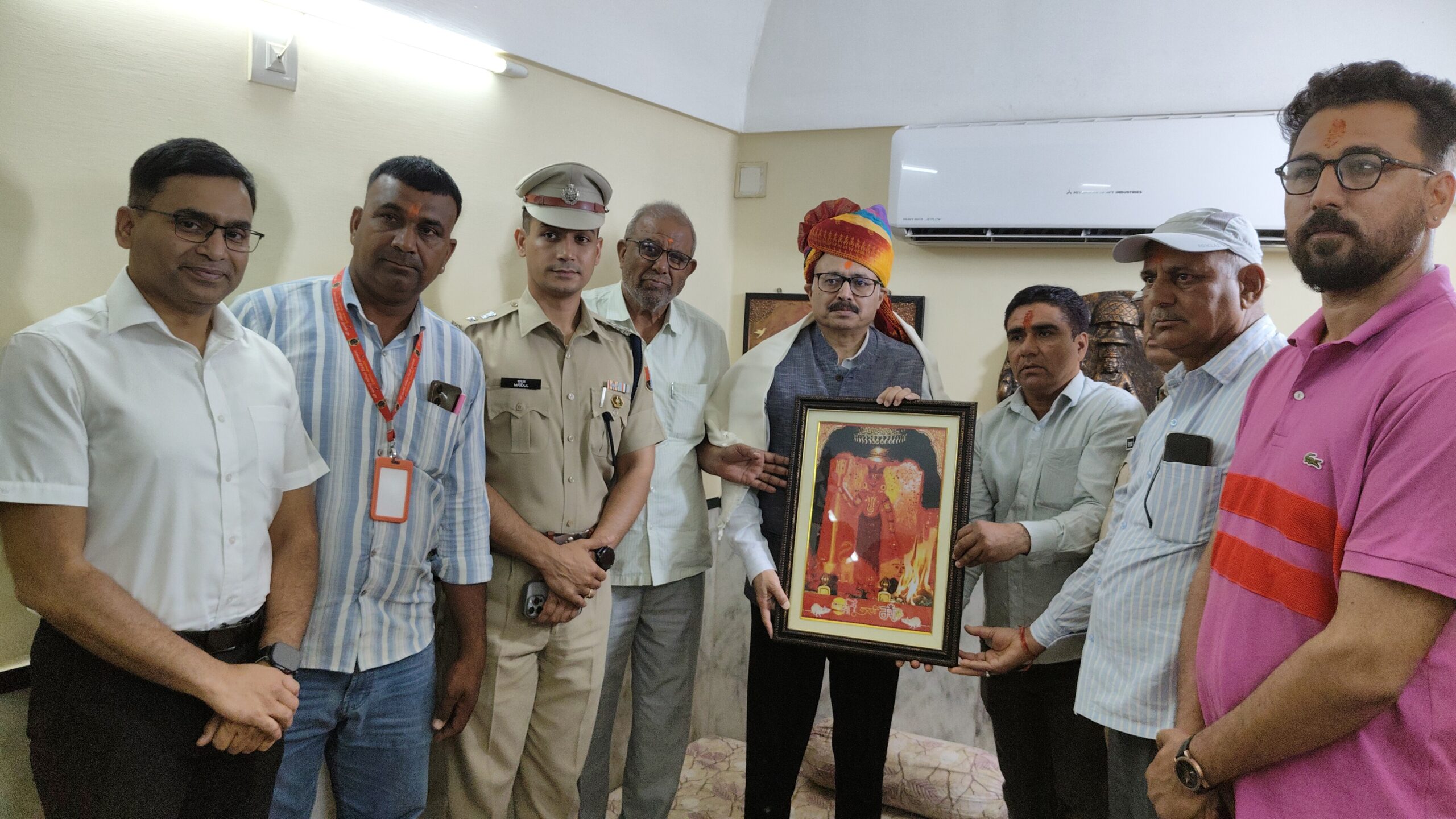 अबतक इंडिया न्यूज़ देशनोक 1 अप्रैल। बुधवार को राजस्थान डीजीपी राजीव शर्मा ने देशनोक पहुंचकर मां करणी के दर्शन किए।मंदिर में विशेष पूजा-अर्चना कर प्रदेश की सुख -शांति की कामना की।मंदिर प्रन्यास की ओर से अध्यक्ष बादल सिंह व उपाध्यक्ष सीता दान ने साफा,शॉल व मां करणी की तस्वीर भेंट कर पारंपरिक स्वागत किया।इस अवसर पर प्रकाश दान पूर्व प्रन्यास अध्यक्ष कैलाश दान आदि मौजूद रहे।