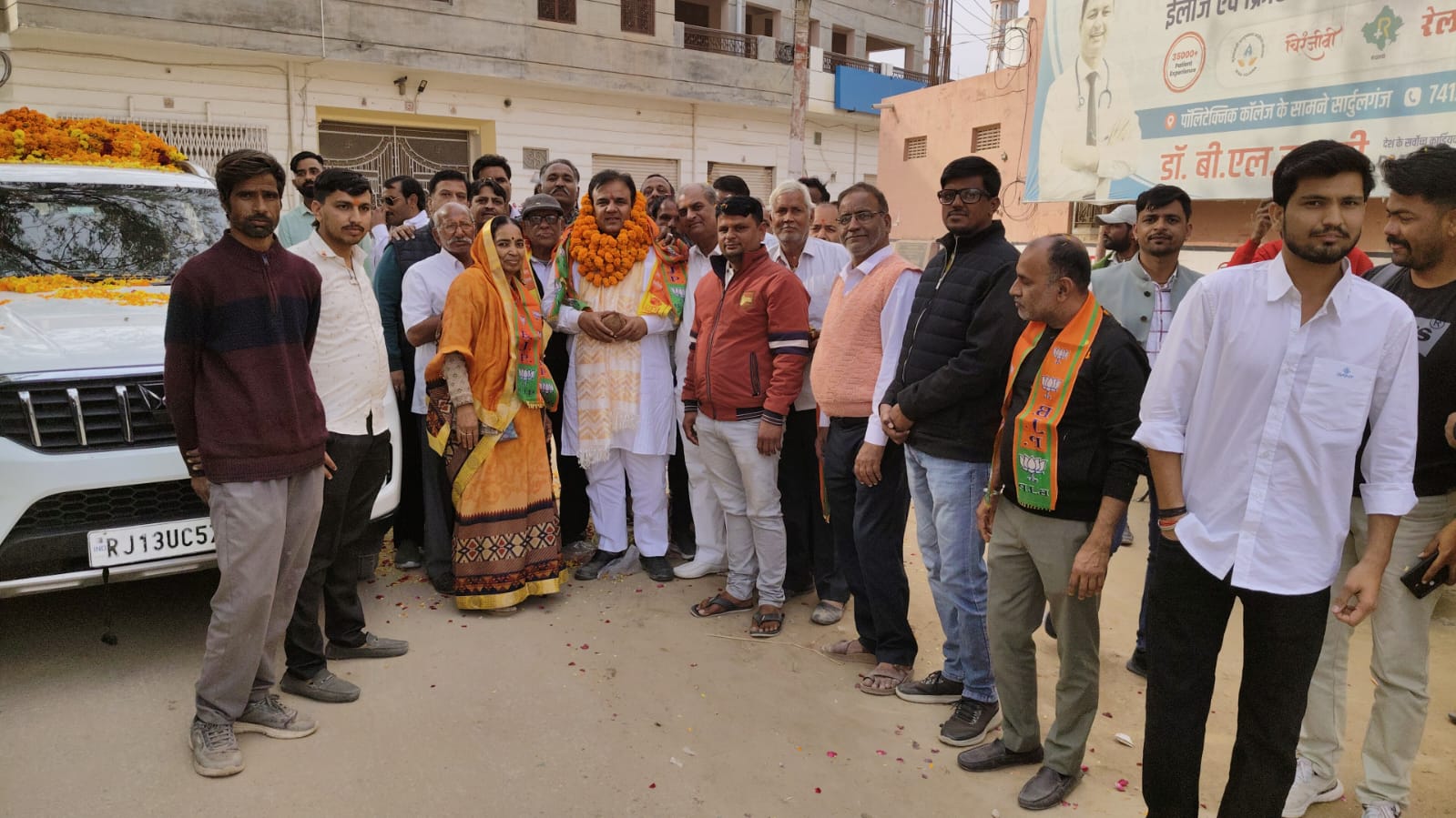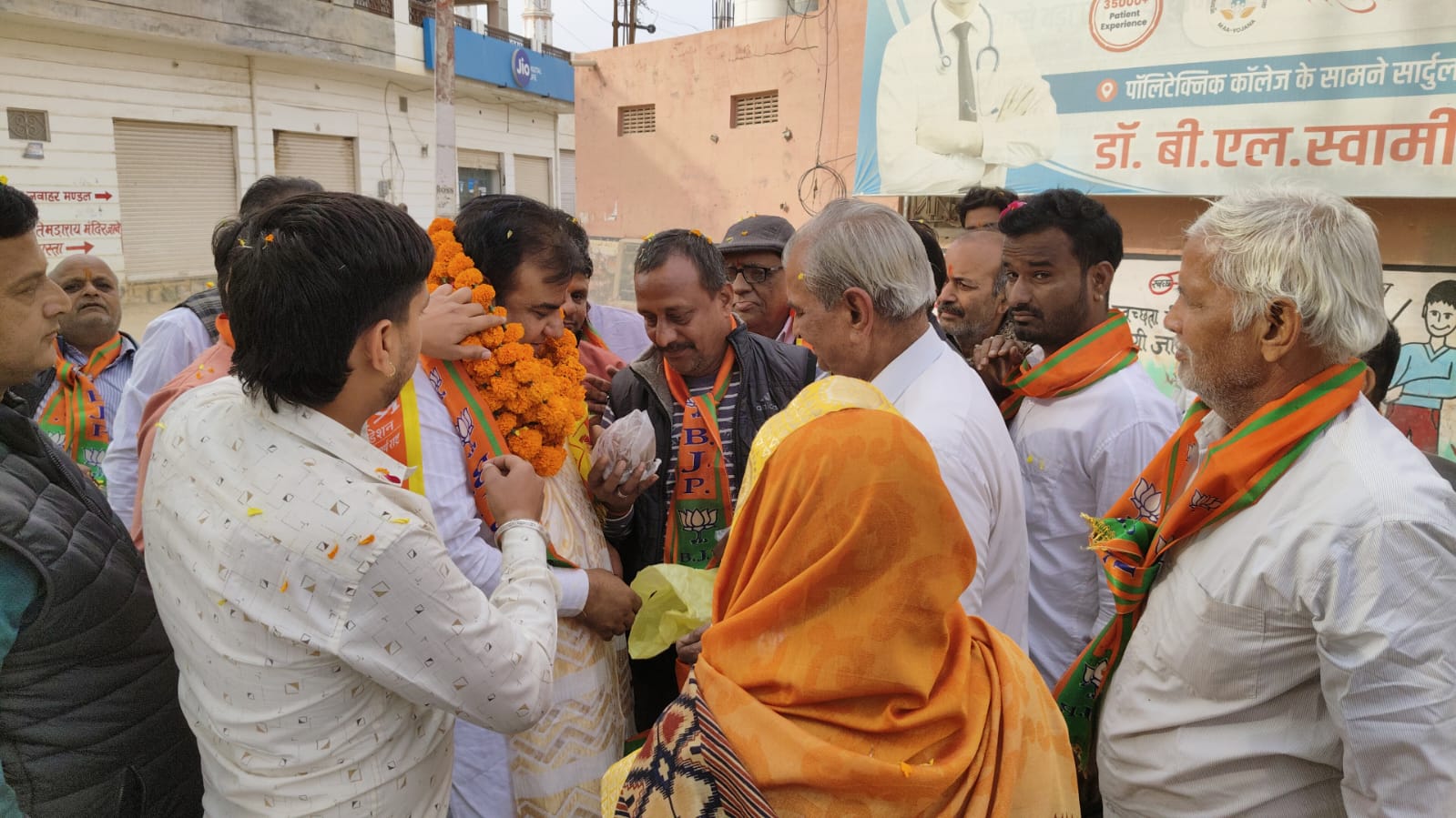 वाहनों के विशाल काफिले के साथ पहुंचे विश्नोई का पुष्पवर्षा से स्वागत किया गया।पूर्व पालिका अध्यक्षा श्री मती सुथार  ने शॉल ओढ़ाकर विश्नोई स्वागत किया।