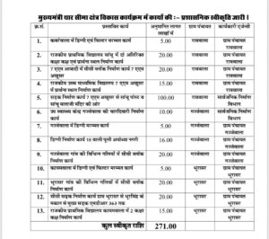 स्वीकृत कार्यों में कबरेवाला में डिग्गी एवं फिल्टर मरम्मत के लिए 5 लाख, सांचू राजकीय प्राथमिक विद्यालय में दो अतिरिक्त कक्षा कक्ष व प्रार्थना स्थल निर्माण के लिए 20 लाख, 7 एएम आबादी में सीसी ब्लॉक निर्माण के लिए 20 लाख, 7 एएम अखूसर राजकीय उच्च माध्यमिक विद्यालय में प्रार्थना स्थल निर्माण के लिए 15 लाख तथा 7 एएम अखूसर से सांचू पोस्ट व सांचू माताजी मंदिर तक सड़क निर्माण के लिए 1 करोड़ शामिल है। इसी प्रकार गज्जेवाला उप स्वास्थ्य केन्द्र की चारदीवारी के लिए 10 लाख, डिग्गी मरम्मत के लिए 5 लाख एवं गांव की गलियों में सीसी ब्लॉक निर्माण के लिए 20 लाख, अयोध्या नगरी (15 वाली पूली) में डिग्गी निर्माण के लिए 16 लाख, कायमवाला में डिग्गी एवं फिल्टर मरम्मत के लिए 5 लाख और राजकीय प्राथमिक विद्यालय में दो कक्षा कक्ष निर्माण के लिए 15 लाख, जबकि भूरासर गांव की गलियों में सीसी ब्लॉक निर्माण के लिए 20 लाख और भूरसिंह के मकान से MDR-363 तक सीसी सड़क निर्माण के लिए 20 लाख की स्वीकृति दी गई है।