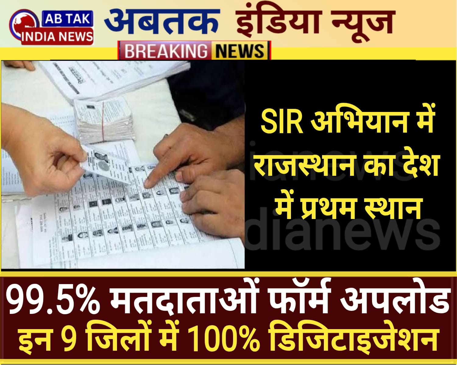 अबतक इंडिया न्यूज जयपुर 4 दिसंबर । भारत में पिछले एक महीने से वोटर लिस्ट को अपडेट करने के लिए विशेष गहन पुनरीक्षण (एसआईआर) अभियान चल रहा है. Special Intensive Revision (SIR) को सबसे पहले बिहार में विधानसभा चुनाव से पहले चलाया गया था. इसके बाद दूसरे चरण में बिहार के बाद देश के 12 राज्यों और केंद्र शासित प्रदेशों में मतदाता सूची का विशेष गहन पुनरीक्षण (एसआईआर) किया जा रहा है. यह अभियान एक महीने पहले 4 नवंबर को शुरू किया गया था और यह आज, 4 दिसंबर तक जारी रहेगा. इसके बाद 9 दिसंबर को ड्राफ्ट लिस्ट प्रकाशित की जाएगी. मतदाता सूची के सत्यापन का अभियान 14 फरवरी को पूरा होगा और उस दिन इन सभी राज्यों और केंद्र शासित प्रदेशों में अंतिम वोटर लिस्ट प्रकाशित की जाएगी.