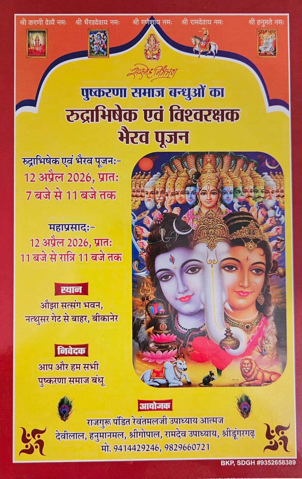 अबतक इंडिया न्यूज 9 अप्रैल बीकानेर। आगामी 12 अप्रेल को बीकानेर में पुष्करणा समाज द्वारा रुद्राभिषेक एवं विश्वरक्षक भैरव पूजन का आयोजन स्थानीय ओझा सत्संग भवन में किया जाएगा। जिसके लिये शहरी और ग्रामीण इलाकों में जनसंपर्क कर कार्यक्रम में शामिल होने का निमंत्रण दिया जा रहा है।