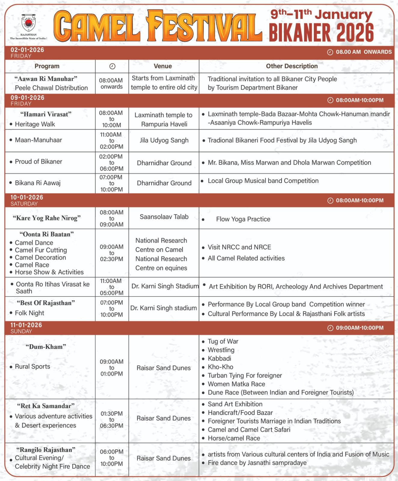 – ⁠दोपहर 2- शाम 6 बजे तक धरणीधर मैदान में प्राऊड एंड प्राइड ऑफ बीकानेर कार्यक्रम का आयोजन (मिस्टर बीकाणा, मिस मरवण शो और ढोला मारू कॉम्पिटिशन का भव्य आयोजन)