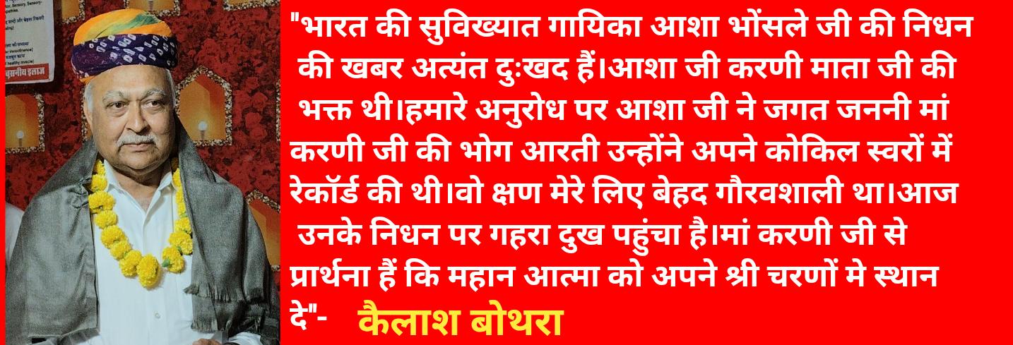 “भारत की सुविख्यात गायिका आशा भोंसले जी की निधन की खबर अत्यंत दुःखद हैं।आशा जी करणी माता जी की भक्त थी।हमारे अनुरोध पर आशा जी ने जगत जननी मां करणी जी की भोग आरती उन्होंने अपने कोकिल स्वरों में रेकॉर्ड की थी।वो क्षण मेरे लिए बेहद गौरवशाली था।आज उनके निधन पर गहरा दुख पहुंचा है।मां करणी जी से प्रार्थना हैं कि महान आत्मा को अपने श्री चरणों मे स्थान दे” -कैलाश बोथरा
