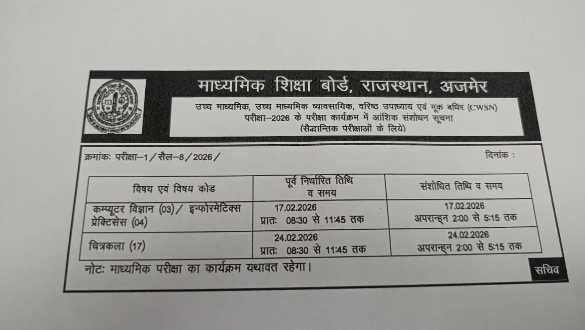 अबतक इंडिया न्यूज 6 फरवरी । राजस्थान माध्यमिक शिक्षा बोर्ड (RBSE) ने 12वीं बोर्ड की दो परीक्षाओं के समय में अहम बदलाव किया है. 17 फरवरी को होने वाली कंप्यूटर विज्ञान व इन्फॉर्मेटिक्स प्रैक्टिकल तथा 24 फरवरी की चित्रकला परीक्षा अब सुबह के बजाय दोपहर पारी में आयोजित होगी. पहले ये परीक्षाएं सुबह 8:30 से 11:45 बजे तक प्रस्तावित थीं, लेकिन अब दोपहर 2:00 से शाम 5:15 बजे तक आयोजित कराई जाएंगी. बोर्ड सचिव ने संशोधित कार्यक्रम जारी कर इसकी पुष्टि की है.