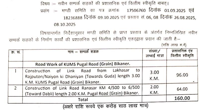 विधायक भाटी ने बताया कि मांग पत्र पर शीघ्र संज्ञान लेते हुए निदेशक एवं पदेन संयुक्त शासन सचिव, कृषि विपणन विभाग, जयपुर द्वारा दिनांक 09.12.2025 को आधिकारिक स्वीकृति जारी कर दी गई है। स्वीकृति के अनुसार – लाखासर से राजपूतों/नाइयों की ढाणियां (ग्राम गुड़ा) तक 3 किमी सड़क, तथा राणासर से डाबली सड़क के किमी 4/500 से 6/500 तक कुल 2 किमी मार्ग के नवीनीकरण/निर्माण के लिए कुल ₹1 करोड़ 60 लाख की प्रशासनिक एवं वित्तीय स्वीकृति प्रदान की गई है ।